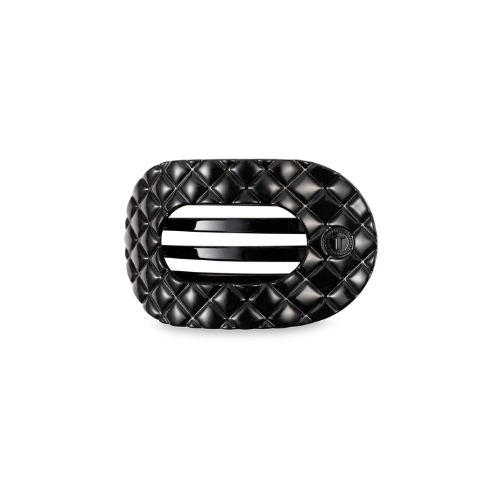 Lay flat and relax with the new TELETIES Jet Black Quilted Small Flat Round Hair Clip in Black. This hair clip is designed to allow you to lay back flat, do yoga, or sit comfortably in a seat with a headrest, and it is made with the same material that is nearly unbreakable.