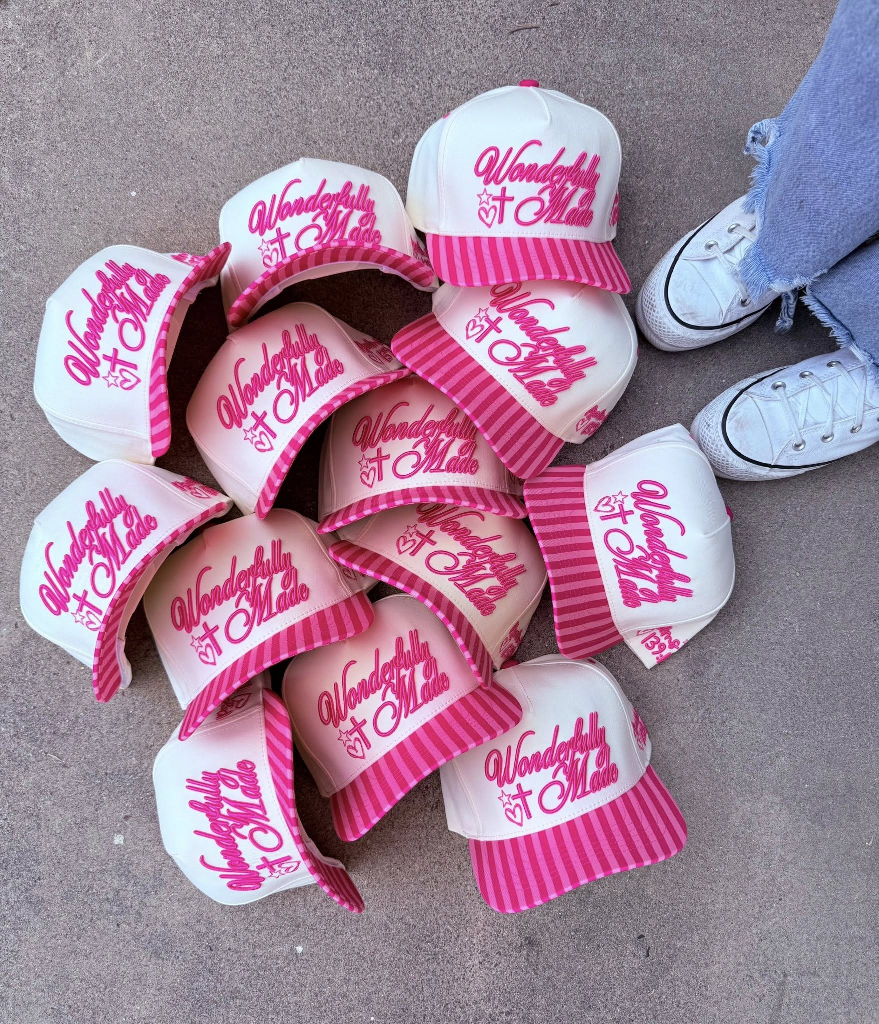 Wonderfully Made Embroidered Cap – Ivory with Pink Stripe Bill