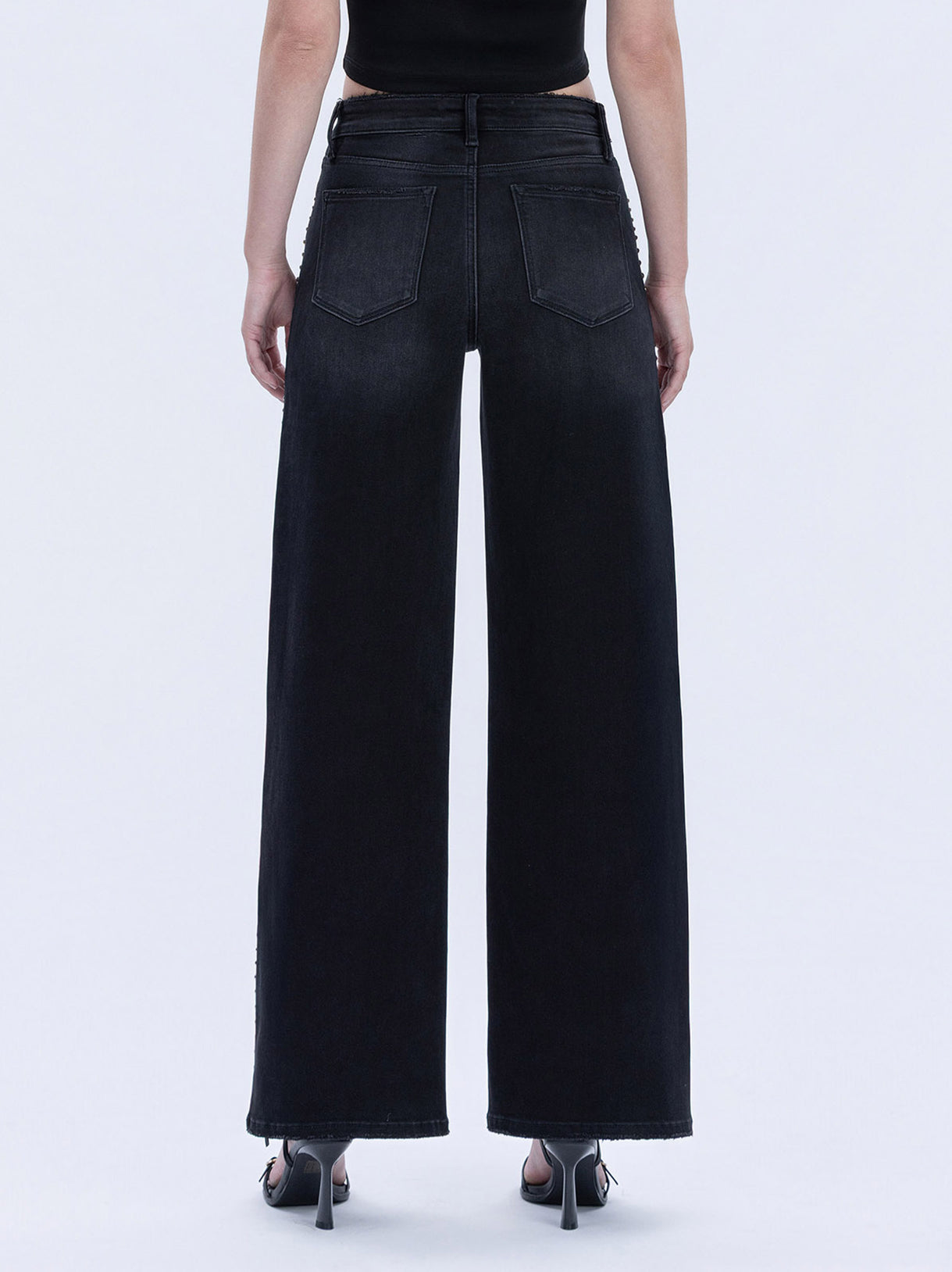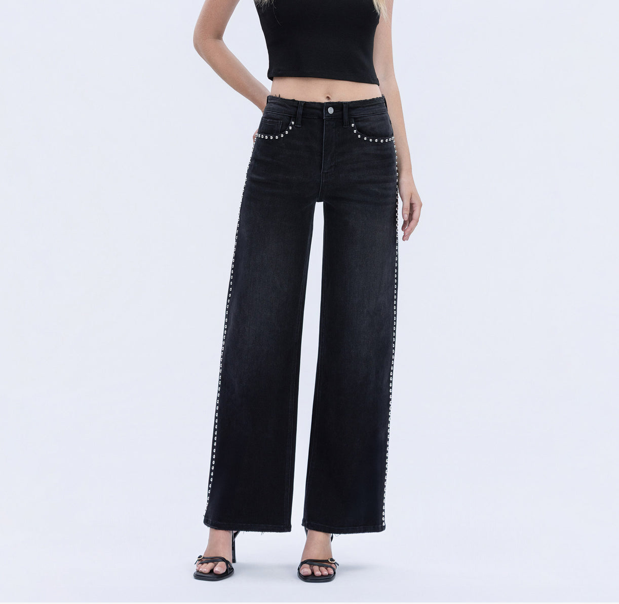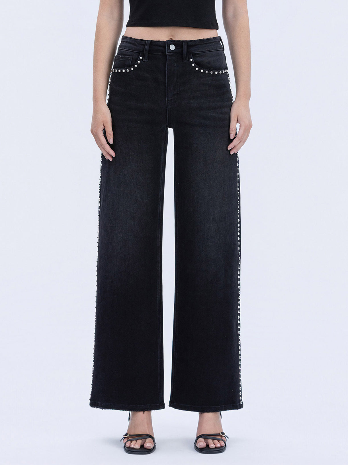 These wide-leg jeans combine comfort stretch denim with a high-rise waist, sparkling silver dome nail head embellishments, and a crisp finished hem for a full-length, effortlessly cool look.