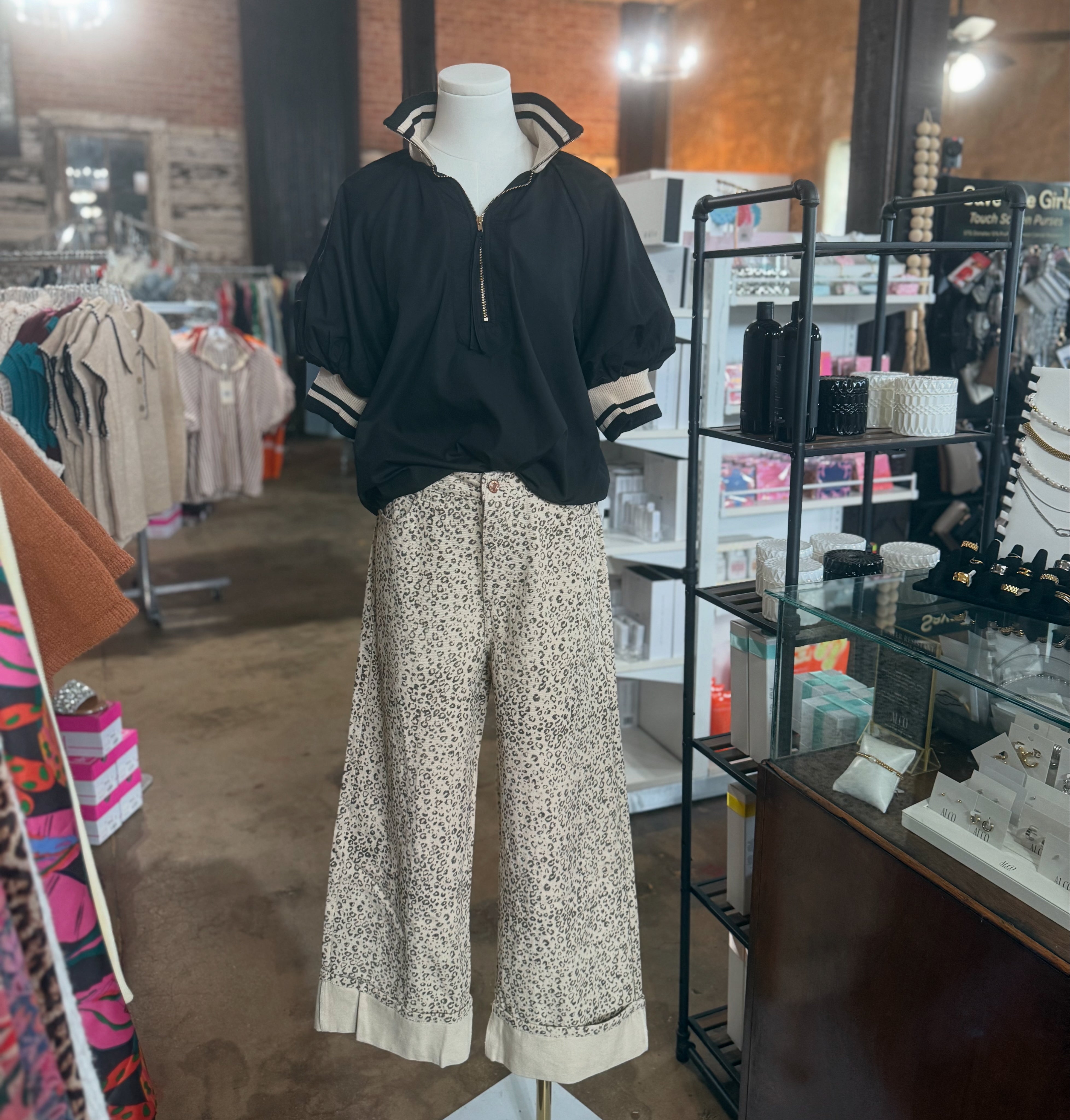Unleash your wild side with these Ecru Leopard Cuff Wide Leg Pants. These jeans feature a bold leopard print and a playful cuff bottom, perfect for a fun and stylish look. The wide leg design adds a touch of chic and comfort to your wardrobe. Let your inner fashionista roar with these pants.