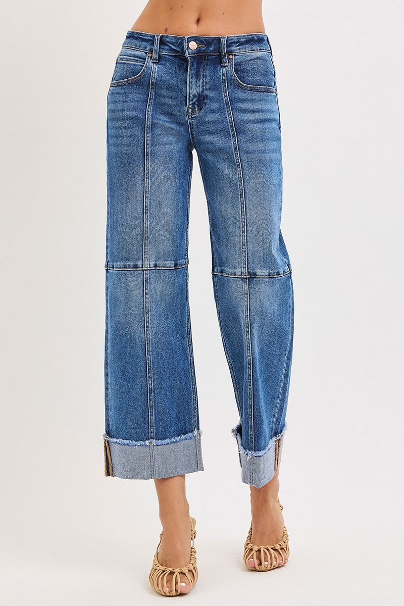 These Risen Slouchy Crop Wide Leg Seam Detailed Jeans bring a fun, relaxed vibe with a 10 1/4" rise and a playful cropped length—27 1/2" inseam after cuff or 30 1/2" before cuff in size 3/26. The cuffs add charm but can’t be released, keeping the look effortlessly stylish. Designed to flatter, the jeans fit true to size; our 5’8.5” model with a 24" waist and 36" hips wears a size 1 for a cozy, slouchy silhouette perfect for casual days with a twist.