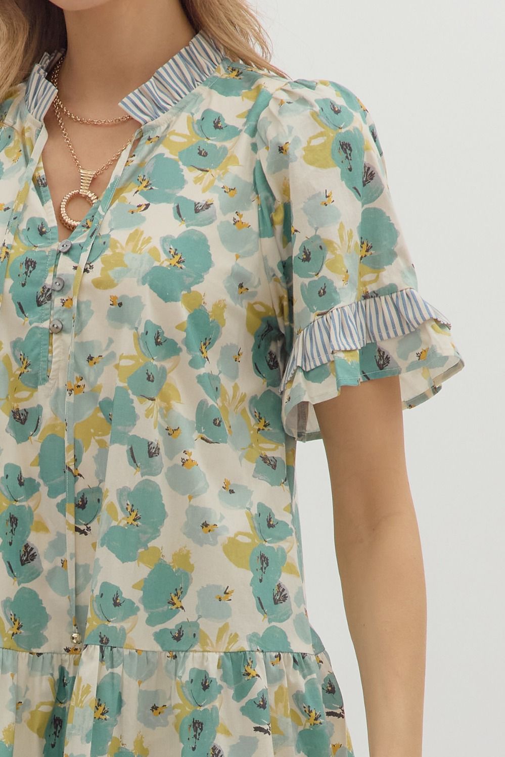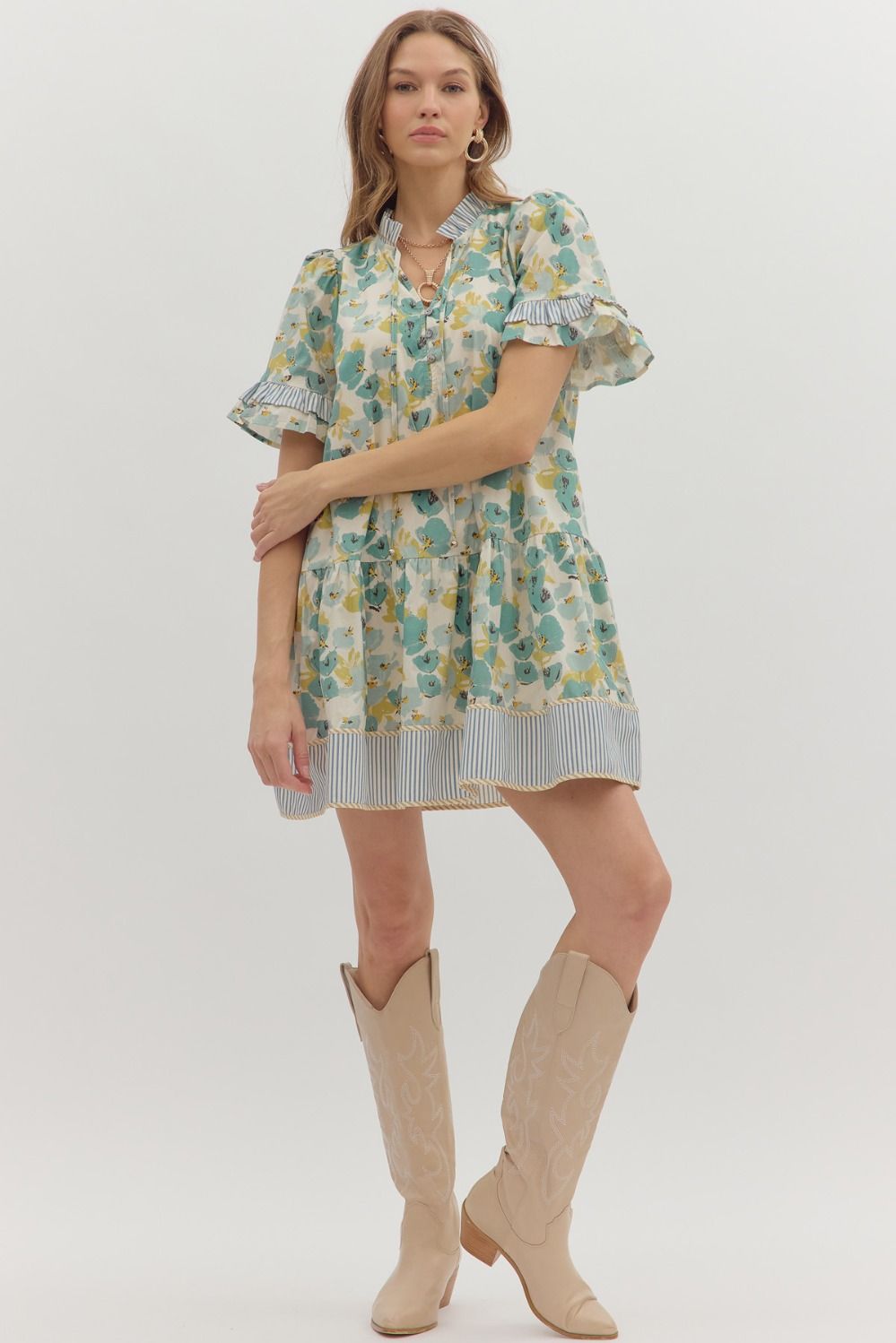 This playful mini dress showcases a floral print with short sleeves and charming striped ruffle accents along the hem. It features a V-neck with a self-tie button closure, handy side pockets, and a lightweight woven fabric that's fully lined and not see-through.