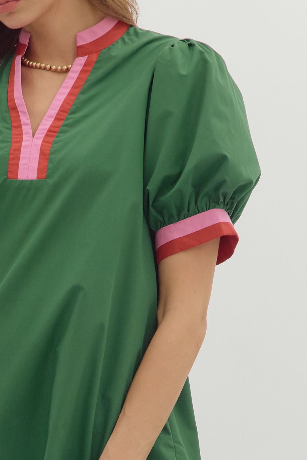 This playful mini dress in hunter green features short sleeves and a vibrant multicolor band detail. It’s woven, lined, and lightweight with handy side pockets, making it both fun and functional without being see-through.