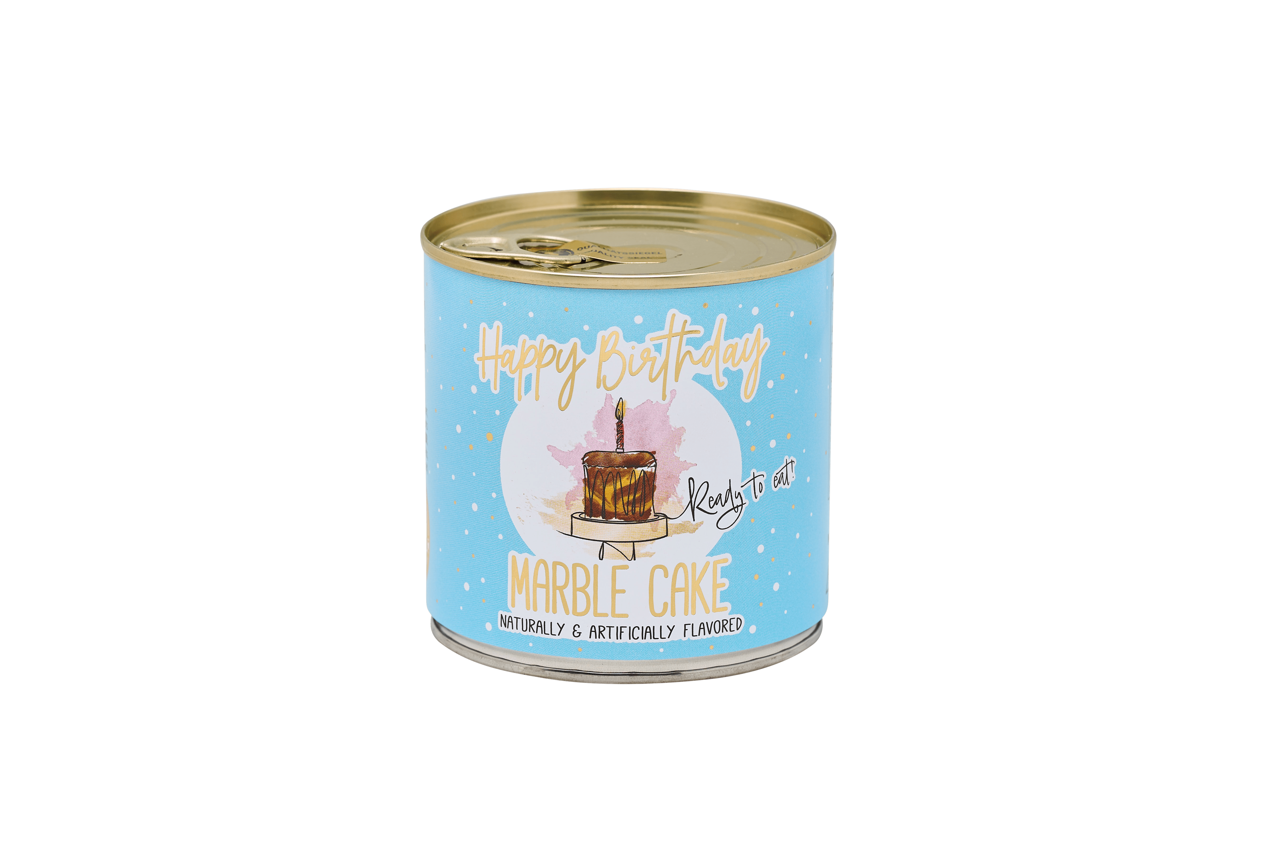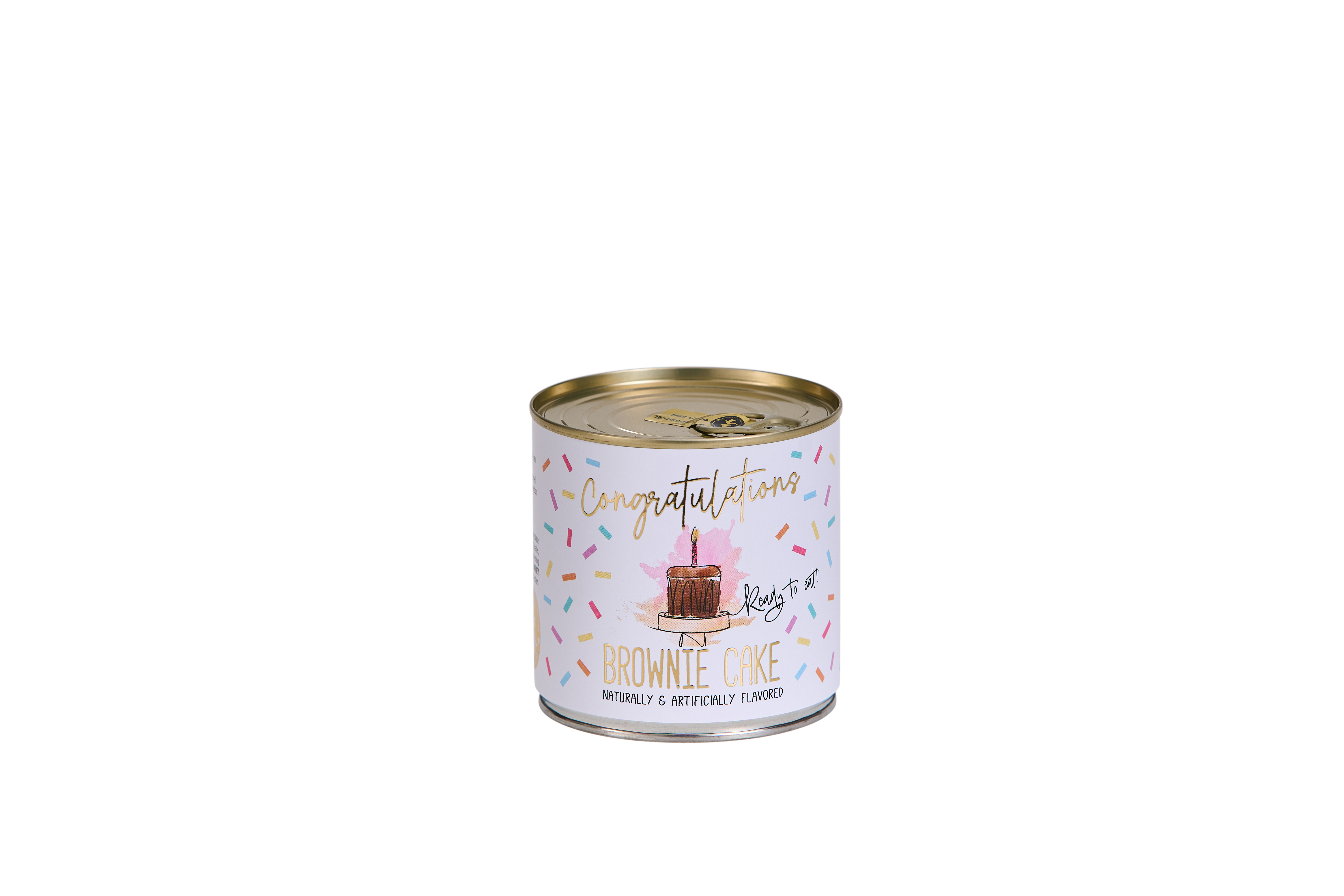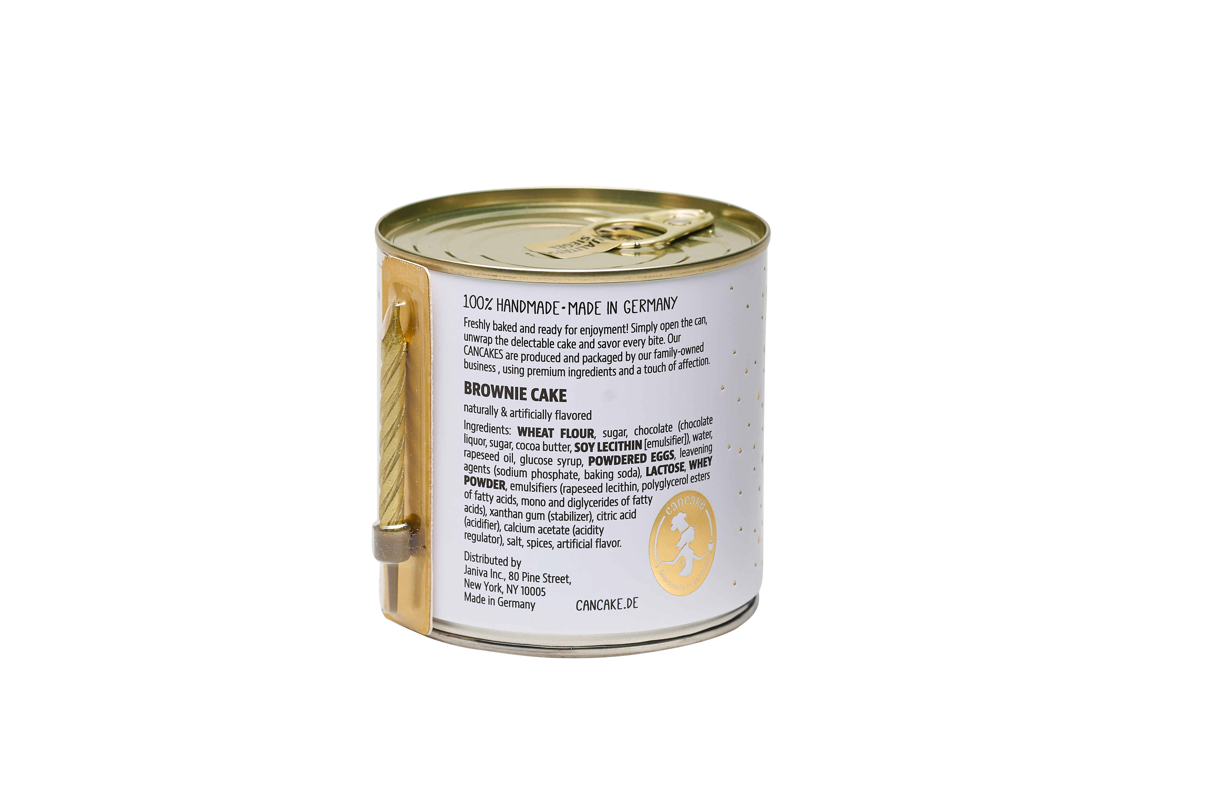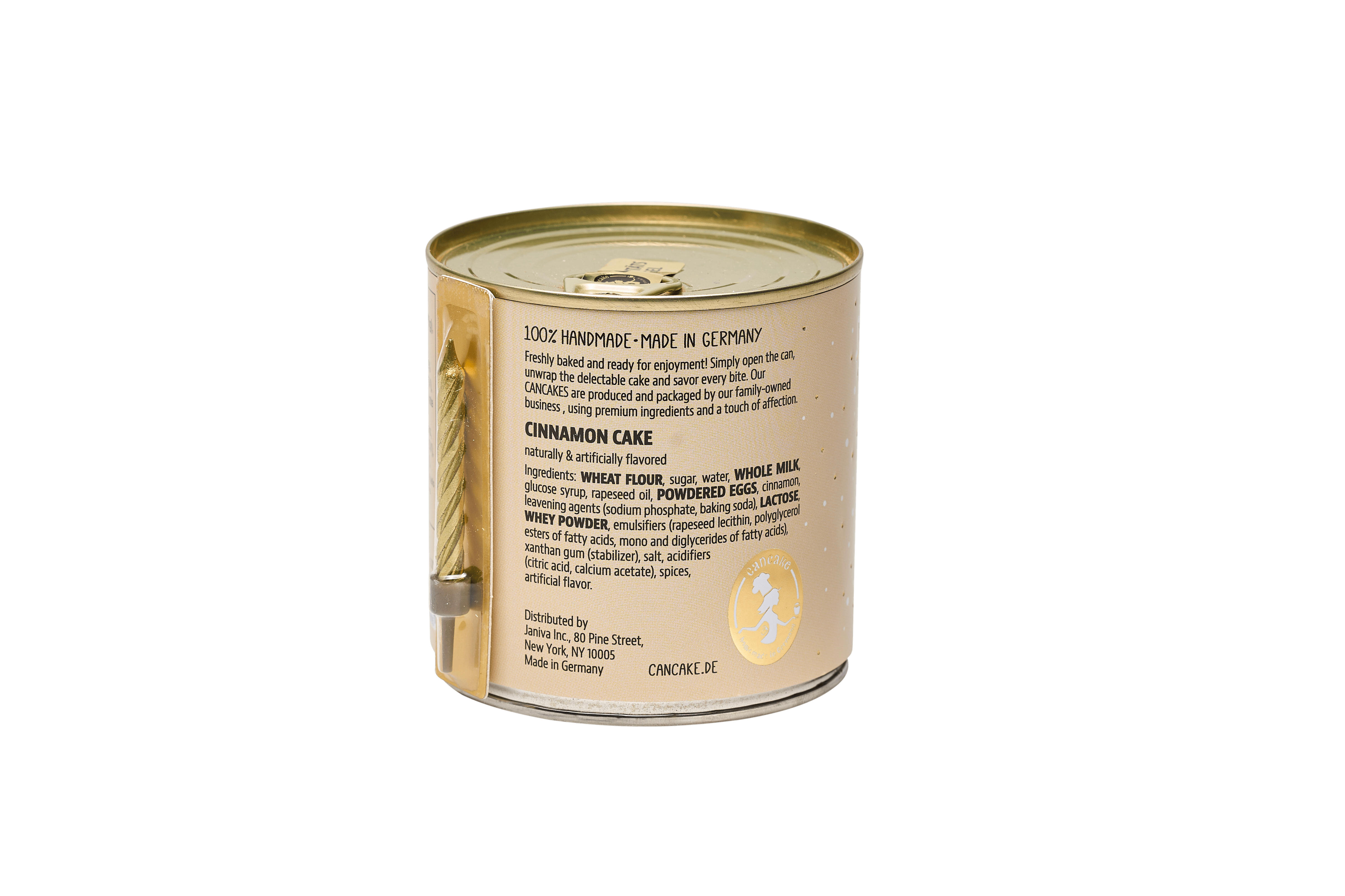 Introducing the CANCAKE: a small, freshly baked cake with a golden candle, made using traditional recipes and baked in a can.