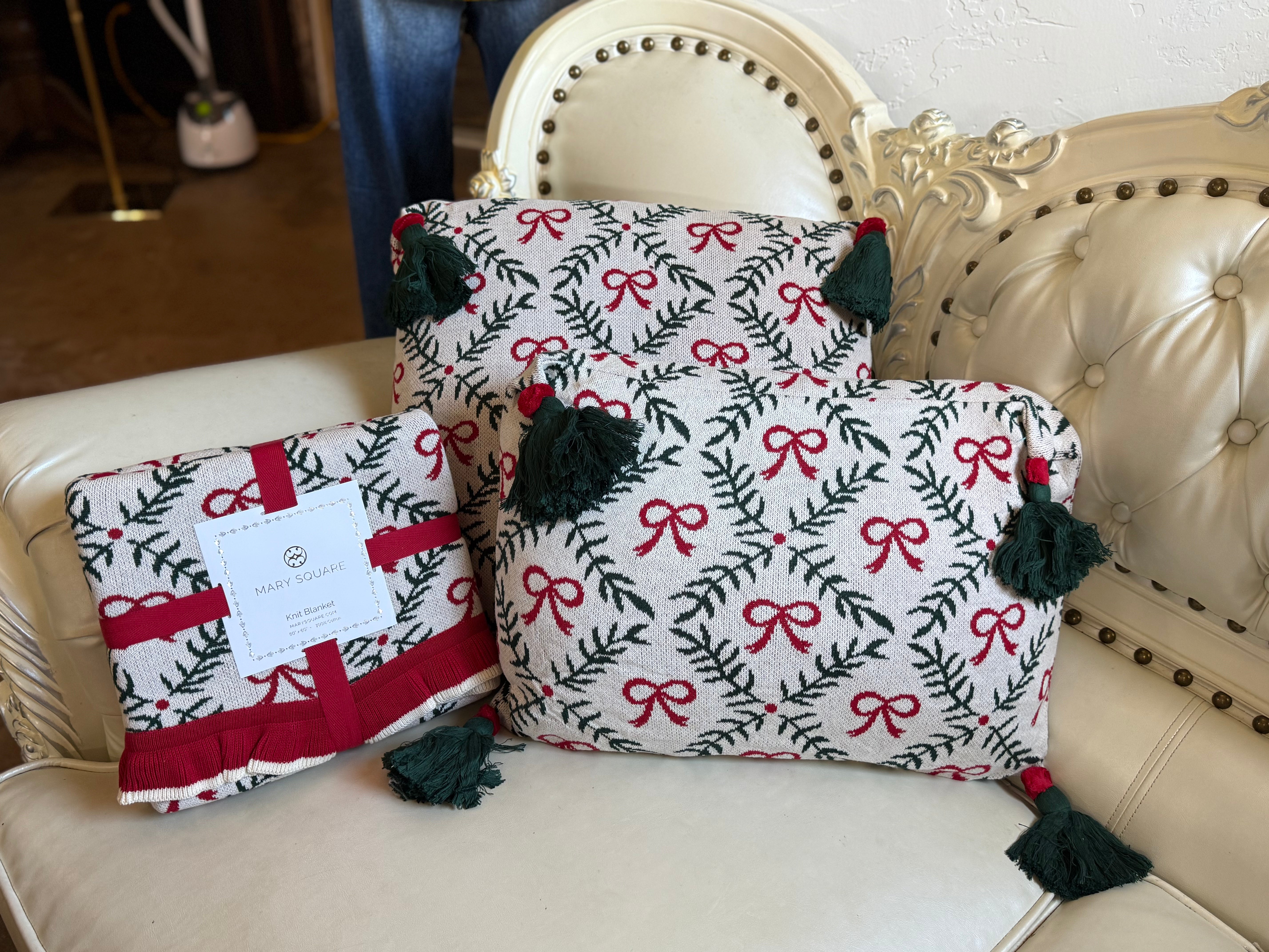 "Get festive with our Holiday Trellis Square Pillow! Perfect for Christmas, it adds a cozy touch to any space. Complete the look with our matching lumbar pillow and blanket, sold separately."