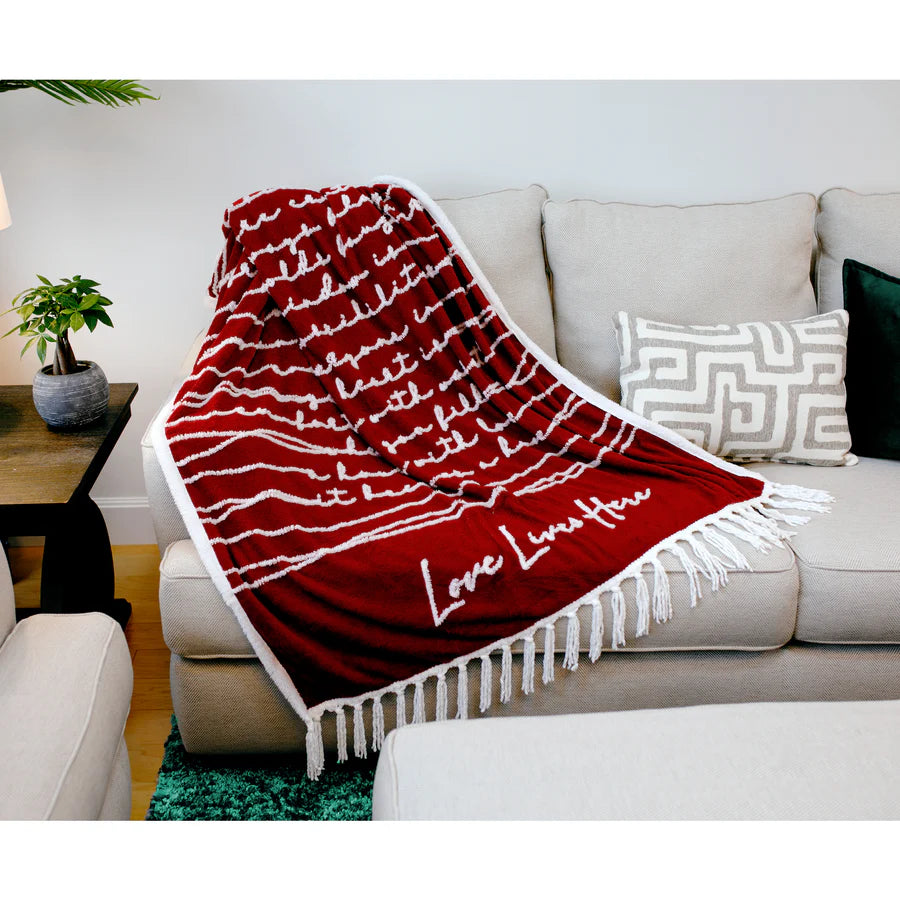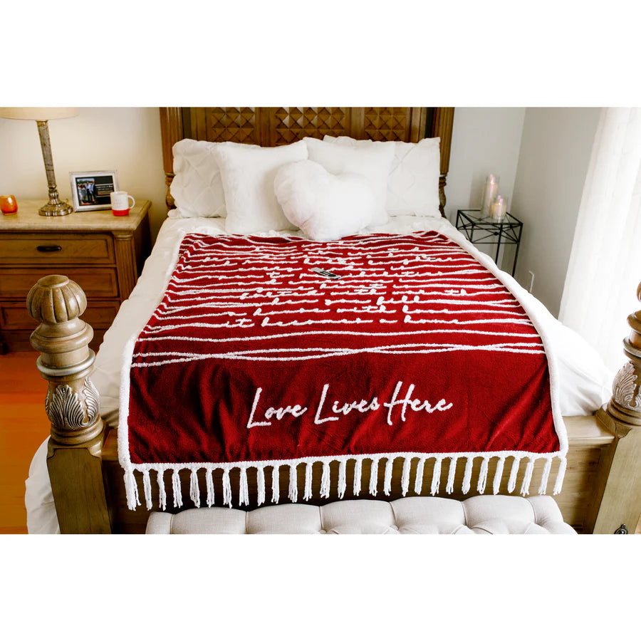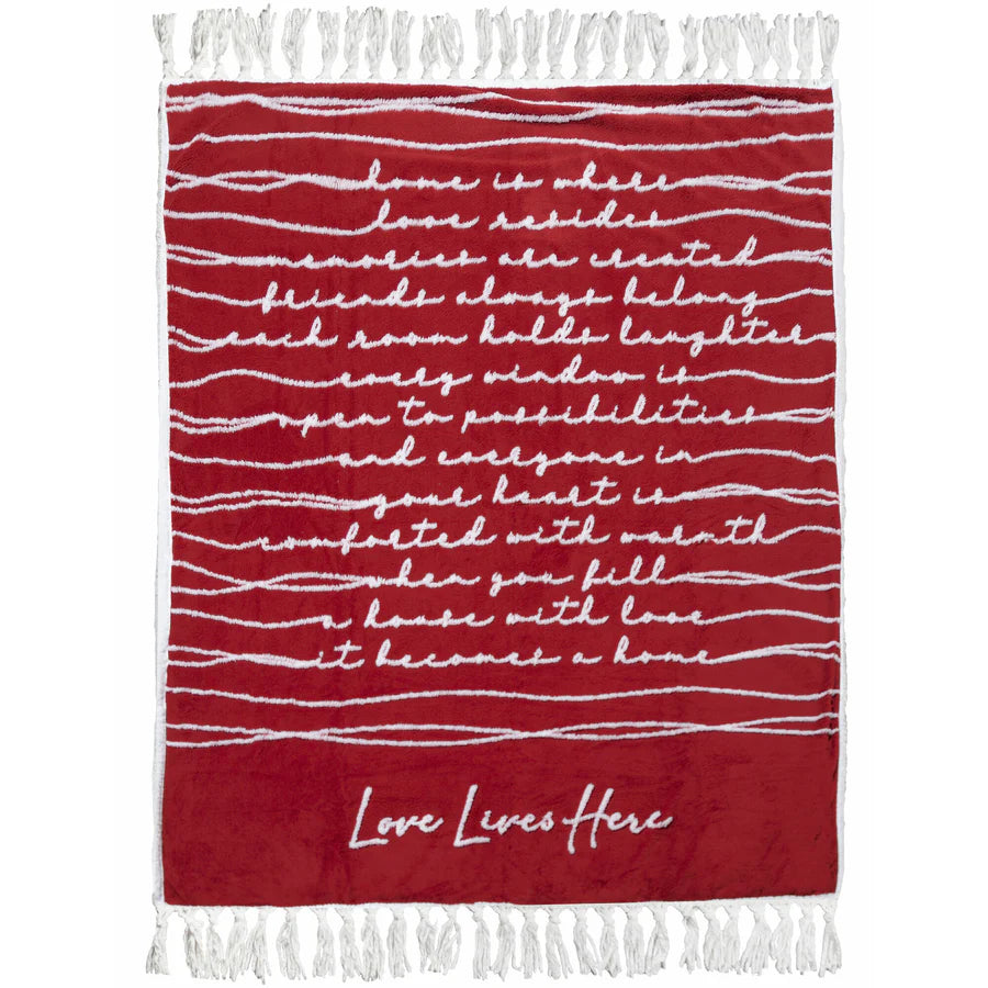 Wrap yourself in warmth and inspiration with the "Love Lives Here" plush blanket. Measuring 50" by 60" with an extra touch of charm from 31 hand-knotted tassels on each end, this cozy 400 GSM polyester jacquard throw extends to a generous 72.5" tall. Its playful cursive sherpa design shares a heartfelt message that brightens any room. Beautifully packaged with a silk white ribbon and elegant tag, it’s ready to gift or keep for those snug moments filled with love and laughter.