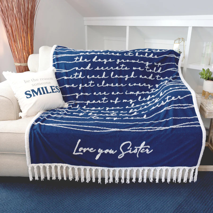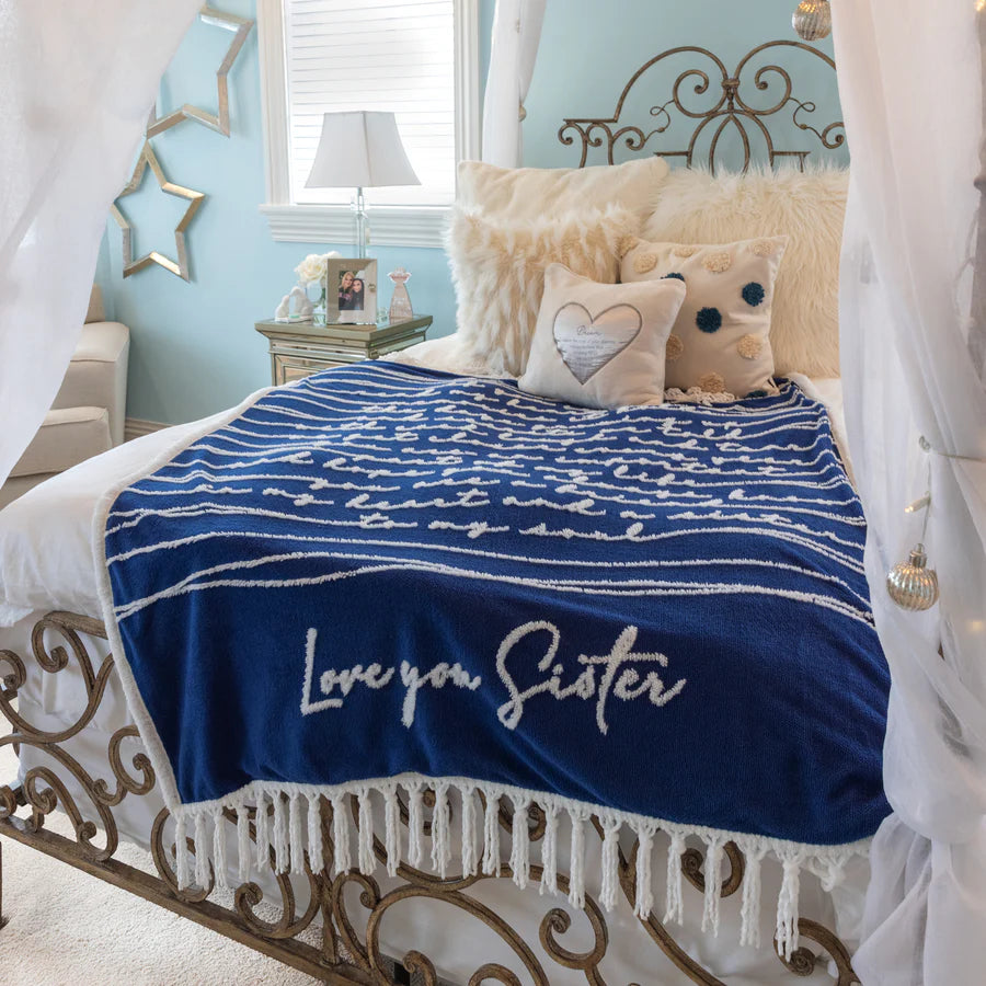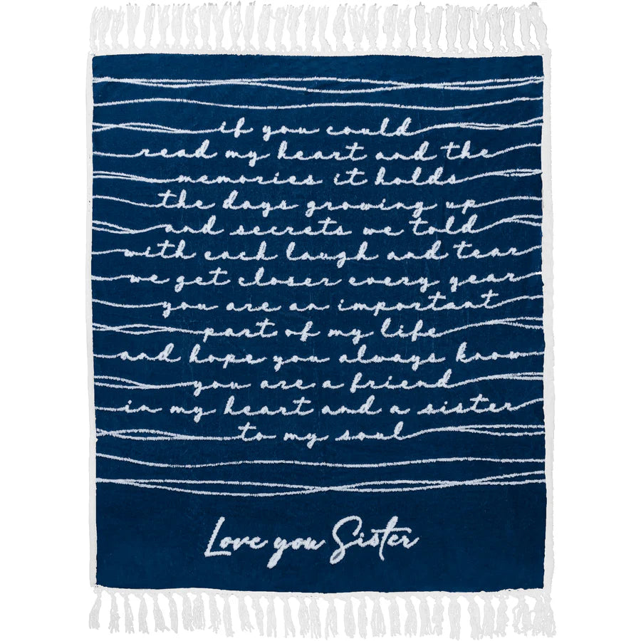 Risen cursive sherpa "If You Could Read My Heart And The Memories It Holds, The Days Growing Up And Secrets We Told. With Each Laugh And Tear, We Get Closer Every Year. You Are An Important Part Of My Life, And Hope You Always Know You Are A Friend In My Heart And A Sister To My Soul. Love You Sister" sentiment is conveyed by wave-like thread lines connecting the ends of the words to the edge of the blanket on beautiful soft blue background.