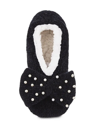 Cuddly Pompom Chenille Slippers is a pair of black slippers with colorful pom-poms