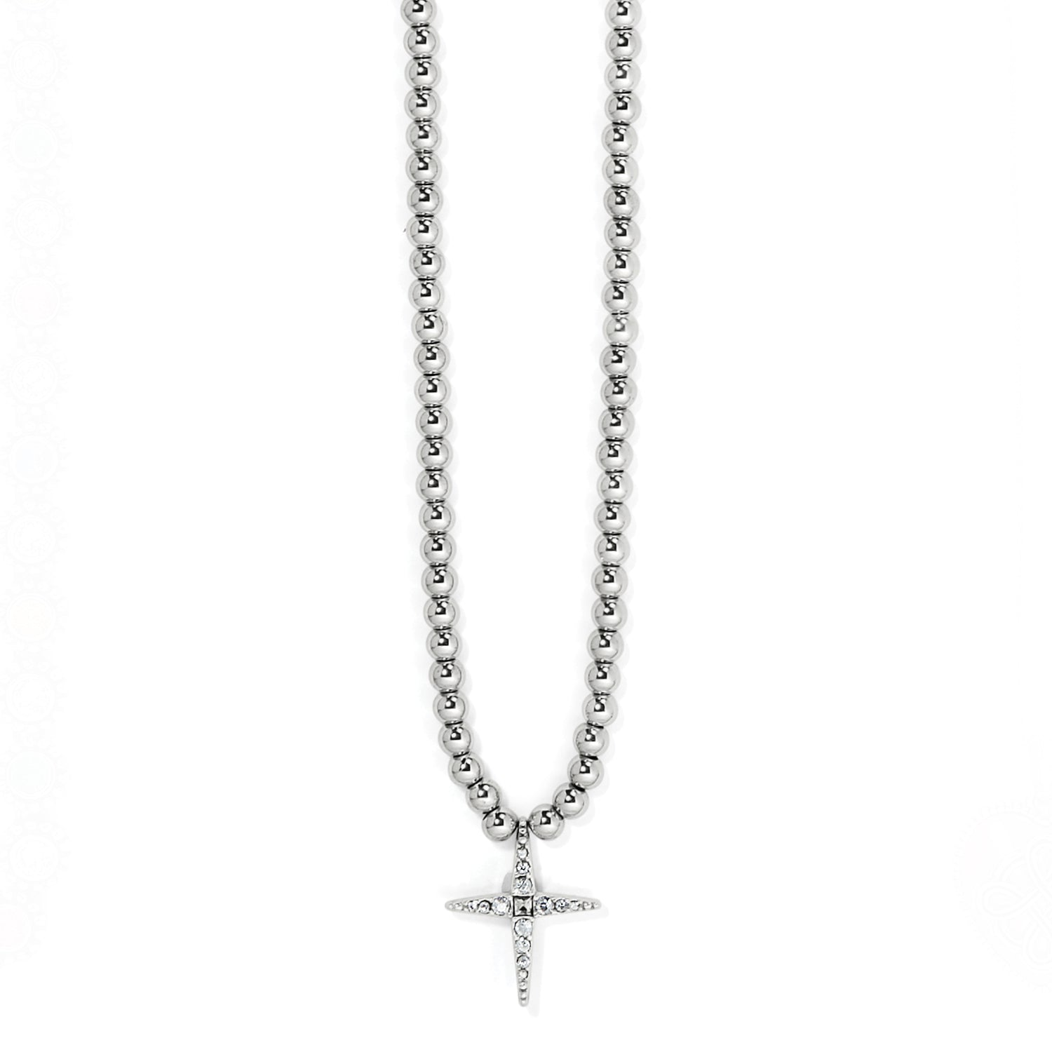 Four beautiful delicate pavé crystals radiate outward from a center square stone to form this petite cross necklace. The cross is suspended by a strand of small silver beads. This necklace is also reversible to an all silver side.
