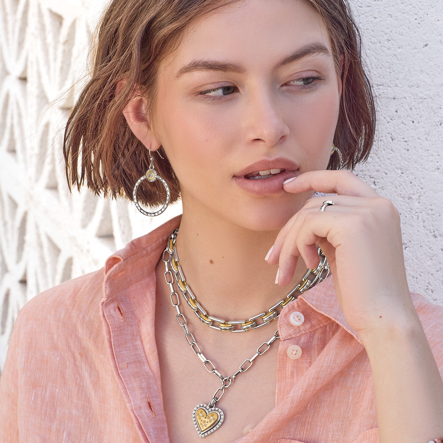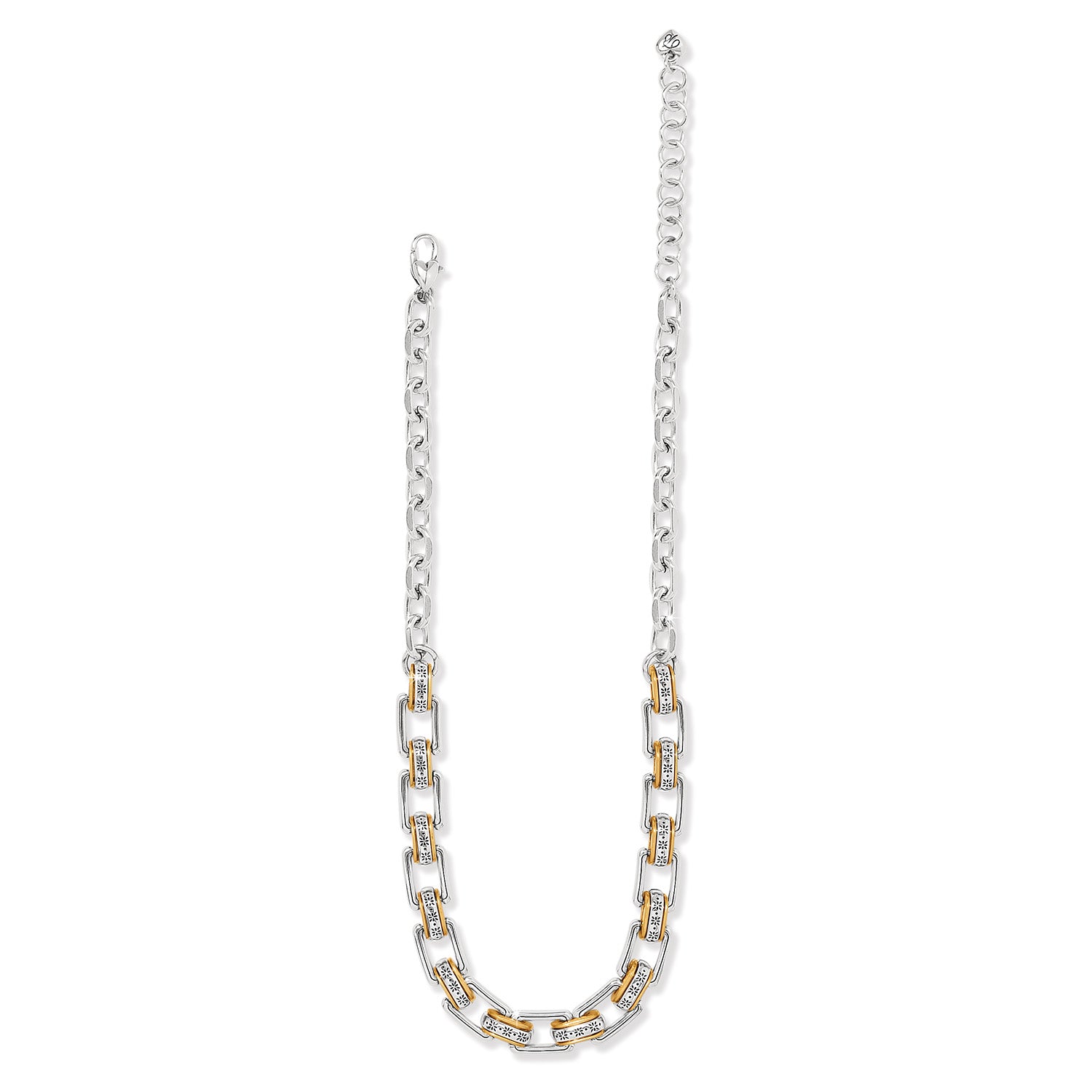 Two-tone links alternate with an elongated silver link and attach to a chain for the remaining length. Links are curved to lie nicely around the neck.
