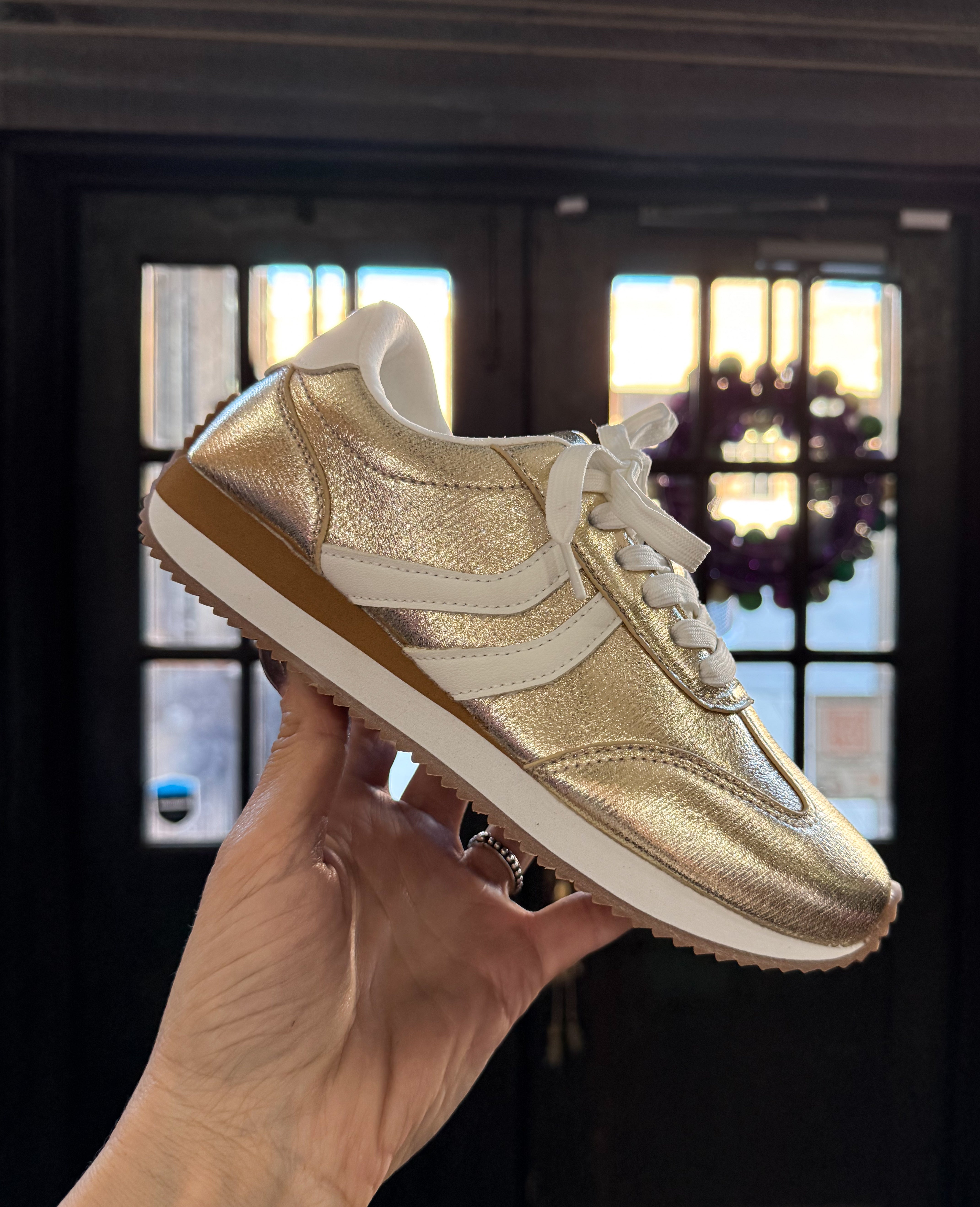 Step into effortless style with the Corkys Kickoff Gold Crinkle Metallic Sneaker—where comfort meets contemporary flair. The subtle 1-inch heel delivers a gentle lift that elevates your look without compromising all-day wearability, while the cushioned insole keeps your feet happy through every adventure. Adjustable lace-up closure ensures a personalized fit, and the durable traction outsole grips confidently on any surface. Playful two-stripe detailing and a supportive heel wrap add just the right amount of sporty-chic personality to your everyday rotation.