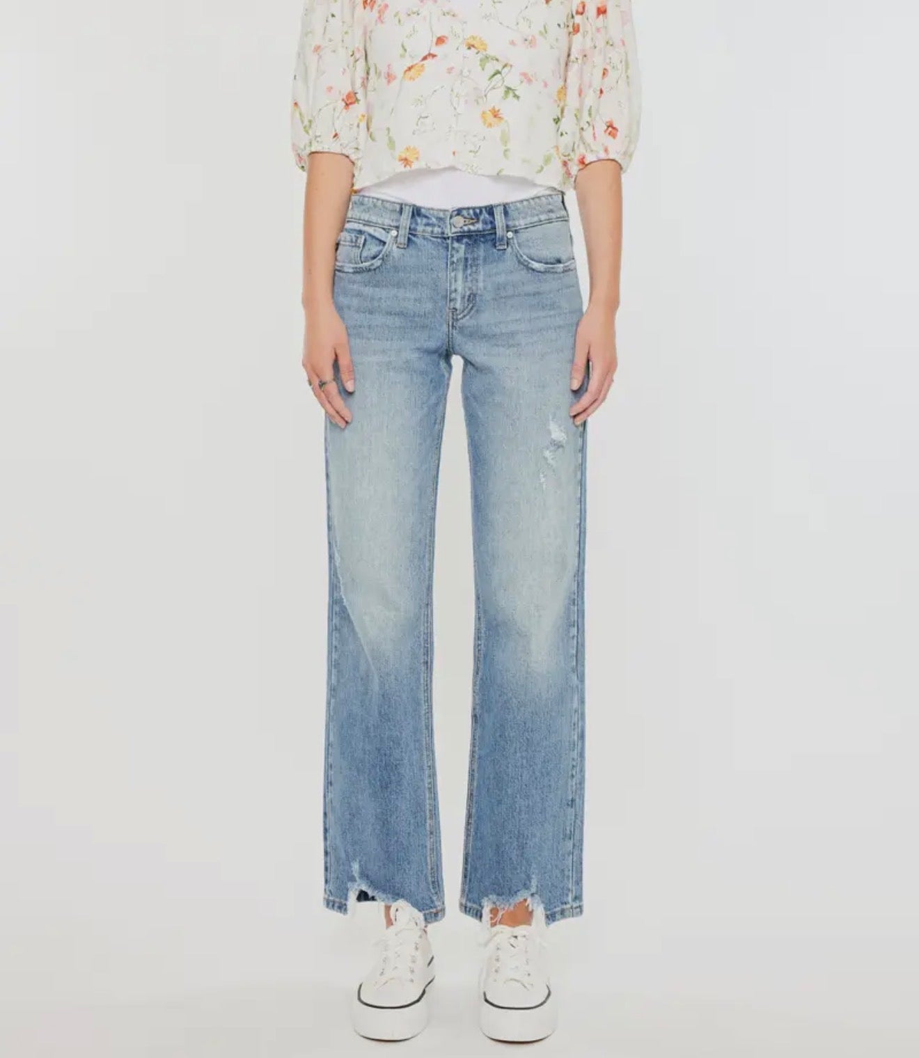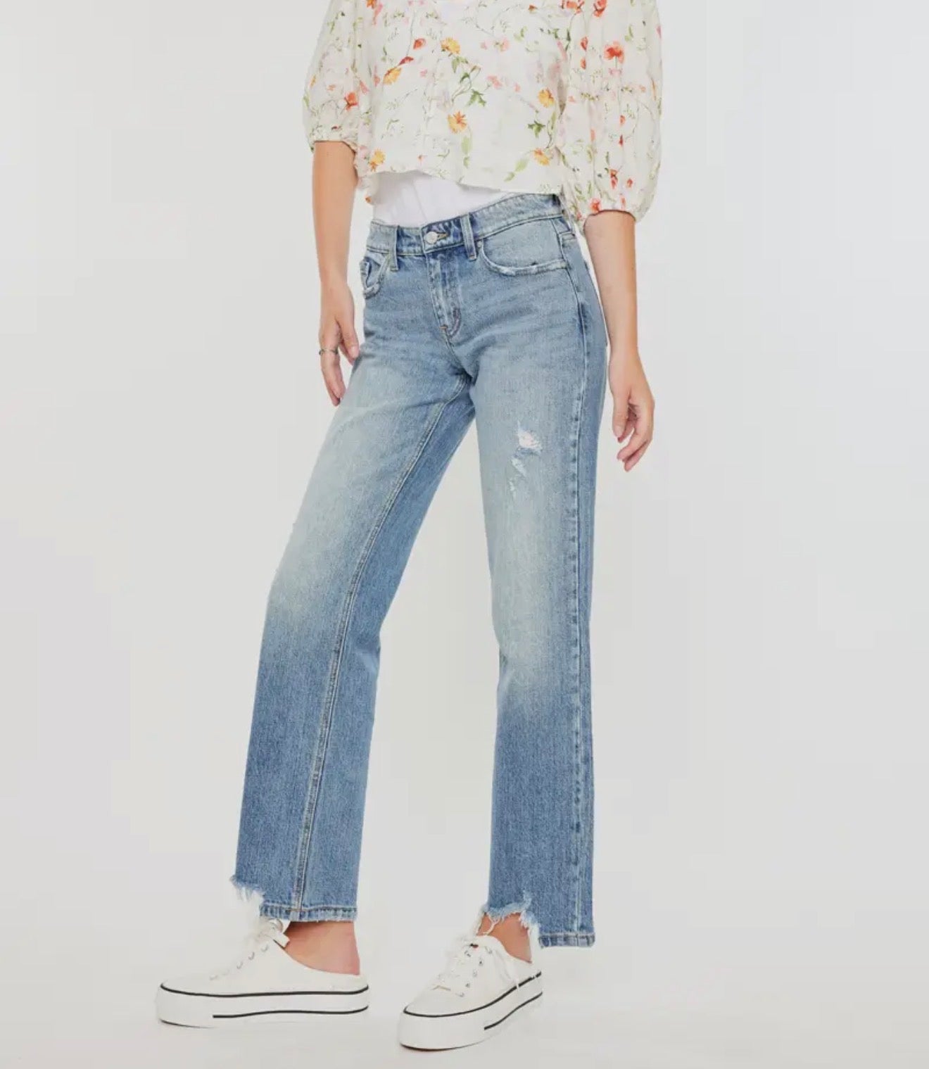 Straight-up denim done right. These KanCan mid-rise jeans hit that sweet spot between classic and cool—true straight cut that works with everything in your closet. Medium wash keeps things versatile, while strategic distressing and a destroyed hem add just enough edge. Built with comfort stretch so you can actually move, featuring a traditional zip fly and five-pocket construction. Fresh from the pack and ready to become your new go-to pair.