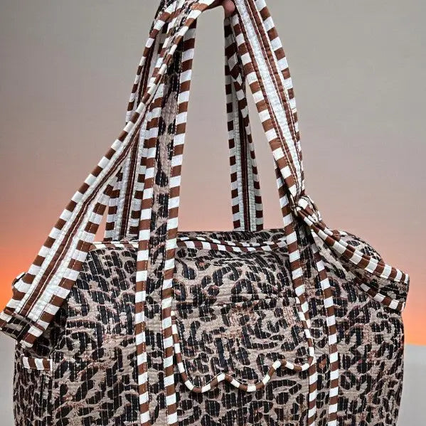 This quilted leopard print duffel bag combines bold style with everyday versatility. Featuring sturdy striped handles, a spacious interior, and soft yet durable fabric, it’s perfect for weekend trips, gym sessions, or carry-on travel. A lightweight statement duffel designed to keep you organized in effortless style.