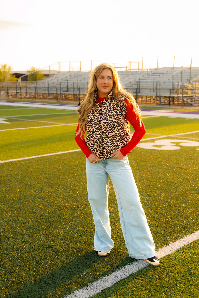 Stay cozy and stylish with this playful leopard puffer vest featuring charming ruffle trim. The button-up design adds a cute, easy layer that’s perfect for chilly days when you want to stand out. Whether you’re layering up for a casual outing or adding flair to your fall wardrobe, this vest combines fun patterns with comfy warmth effortlessly.