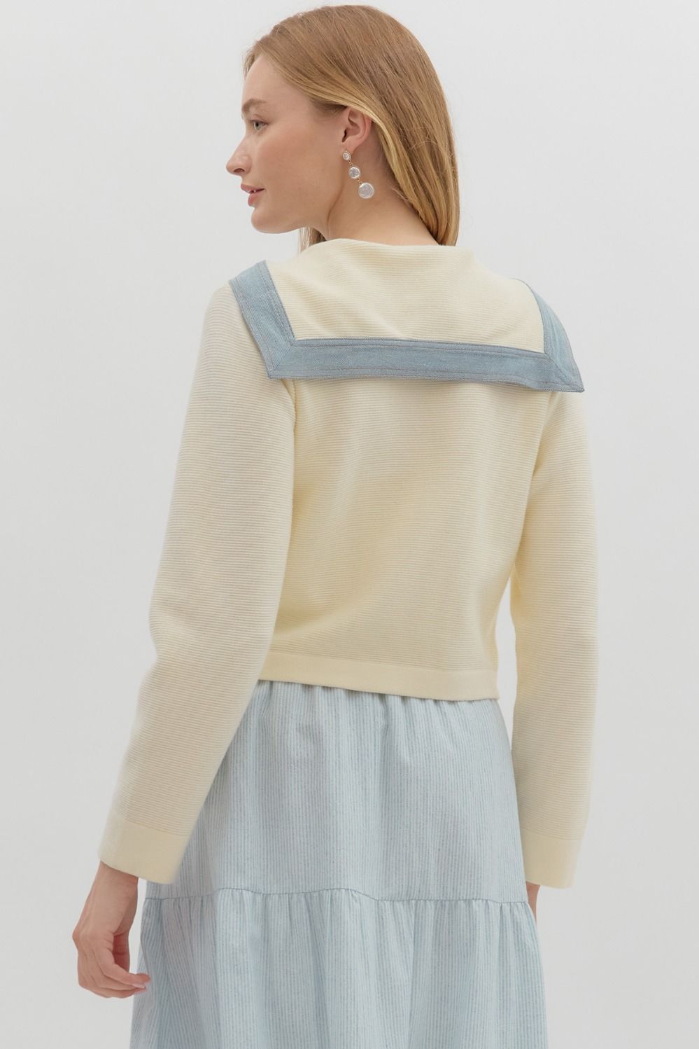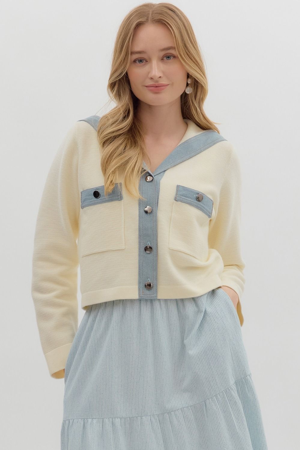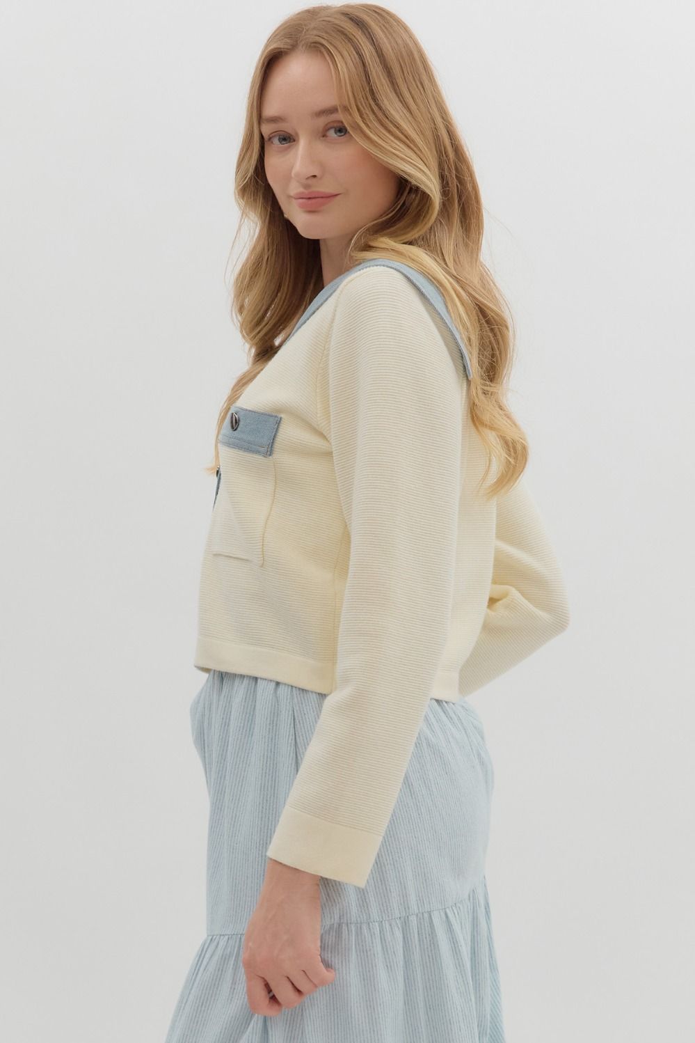 This playful cropped jacket is made from solid sweater knit with long sleeves and features a fun contrast denim sailor collar. It buttons up the front and includes buttoned shirt pockets for added charm. Lightweight and unlined, this knit jacket is cozy without being see-through.