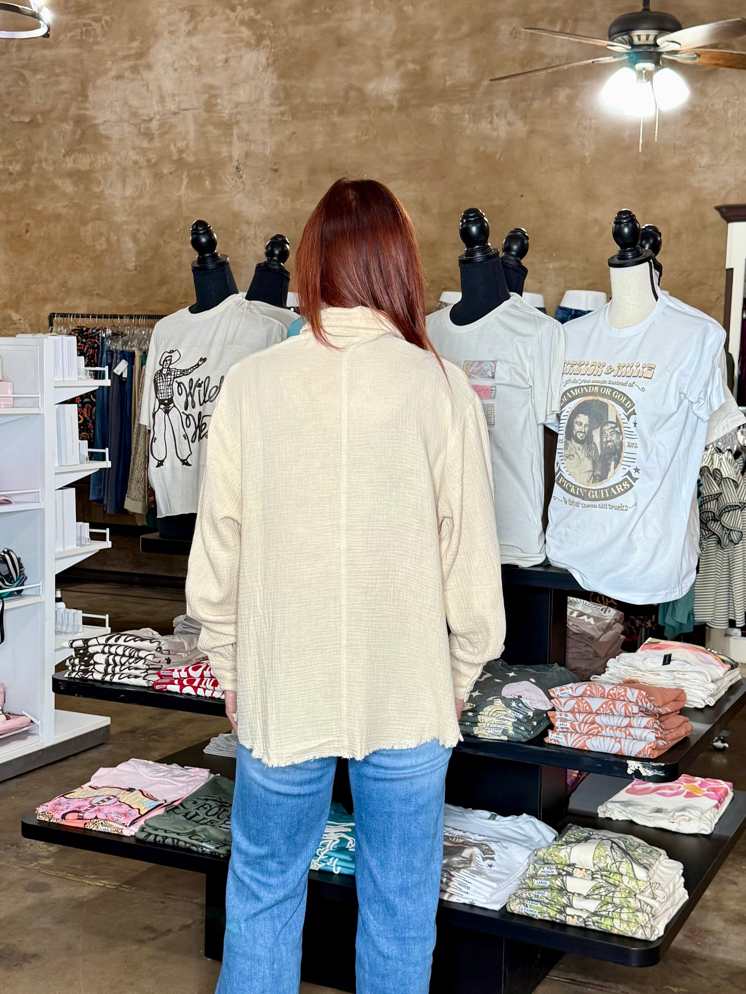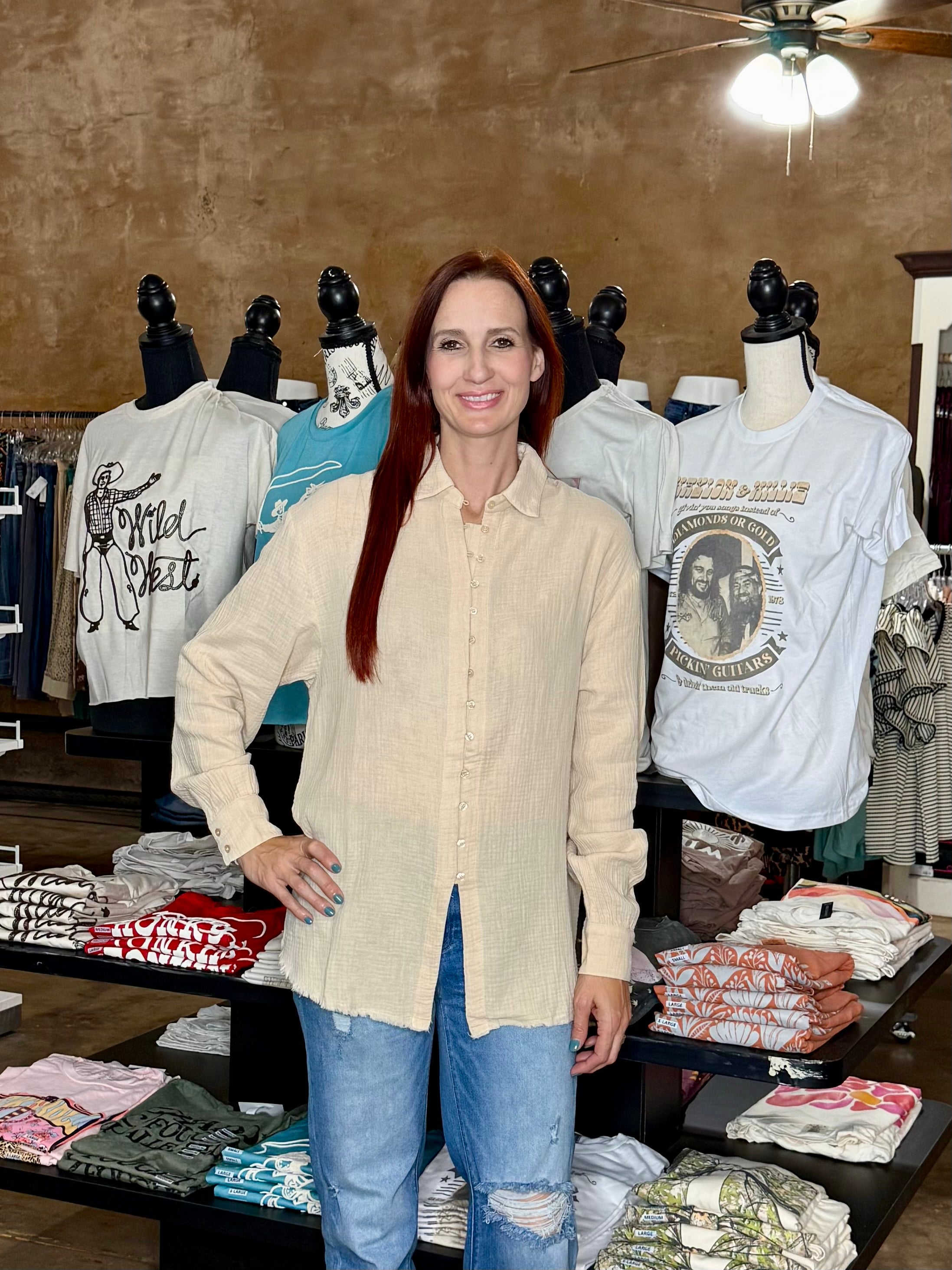 Button Up Collared Gauze Top - 2 Colors! is your new go-to for effortless style. This lightweight gauze beauty features a crisp collar and convenient button-up front, making it perfect for layering or wearing solo. Available in two gorgeous colorways, it's breathable enough for warm weather yet polished enough for casual outings. Throw it on over a tank, tie it at the waist, or wear it open as a breezy cover-up—the possibilities are endless!