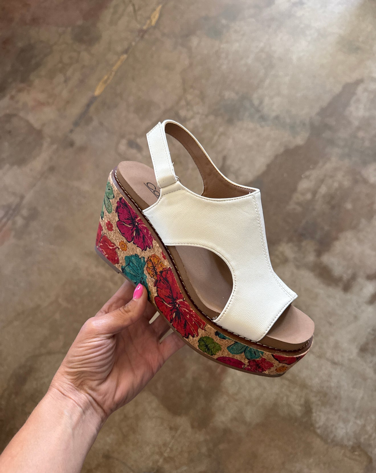 Corkys "Freddie" White Wedge Sandal w/ Floral Heel Design – Grace & Grit Boutique