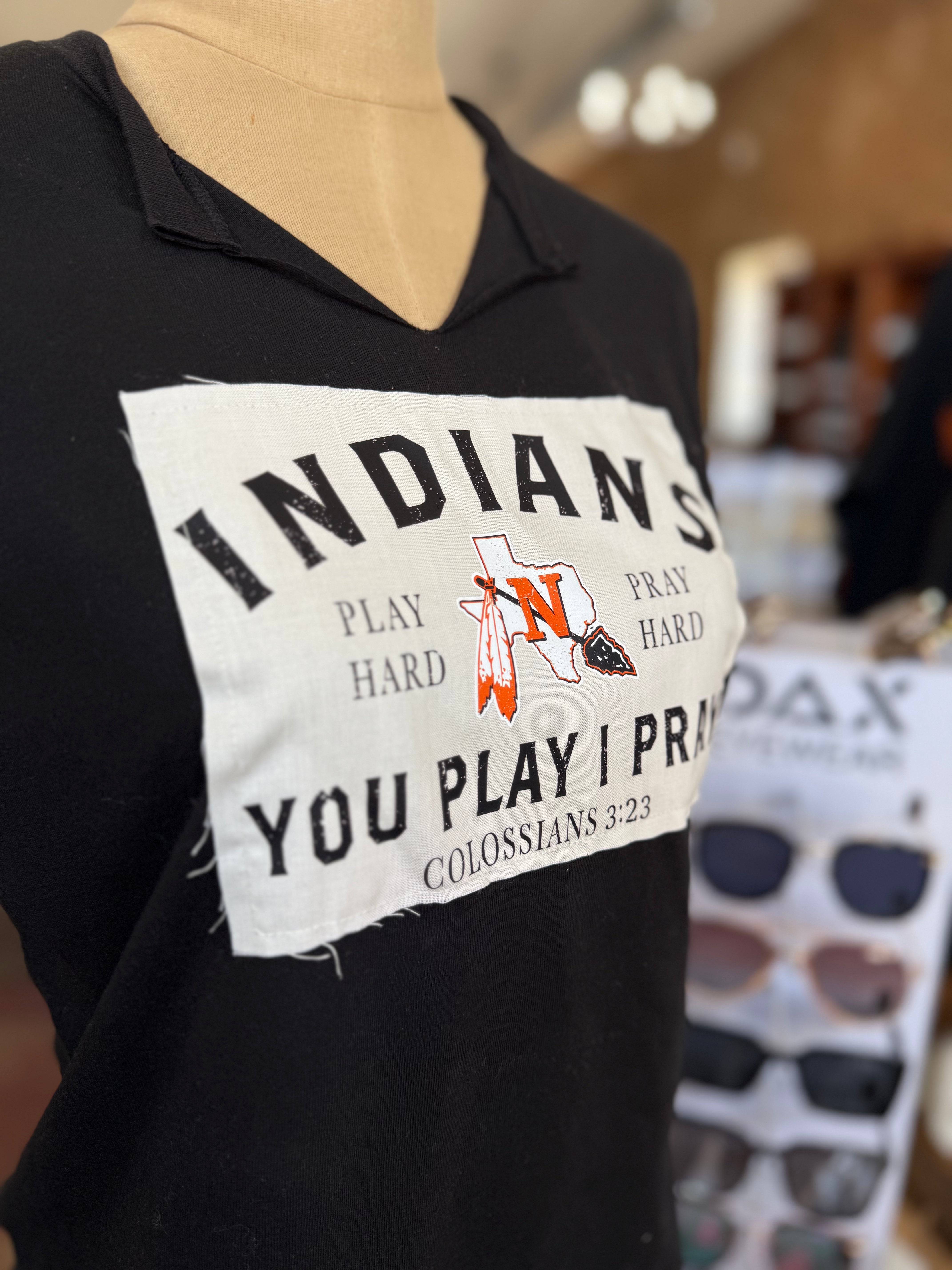 "Add a personalized touch to your game day look with our Custom Patch V-Neck Nocona Indian Top. Featuring a unique custom patch and a stylish V-neck design, this top will elevate any outfit. Show off your team spirit in style!"