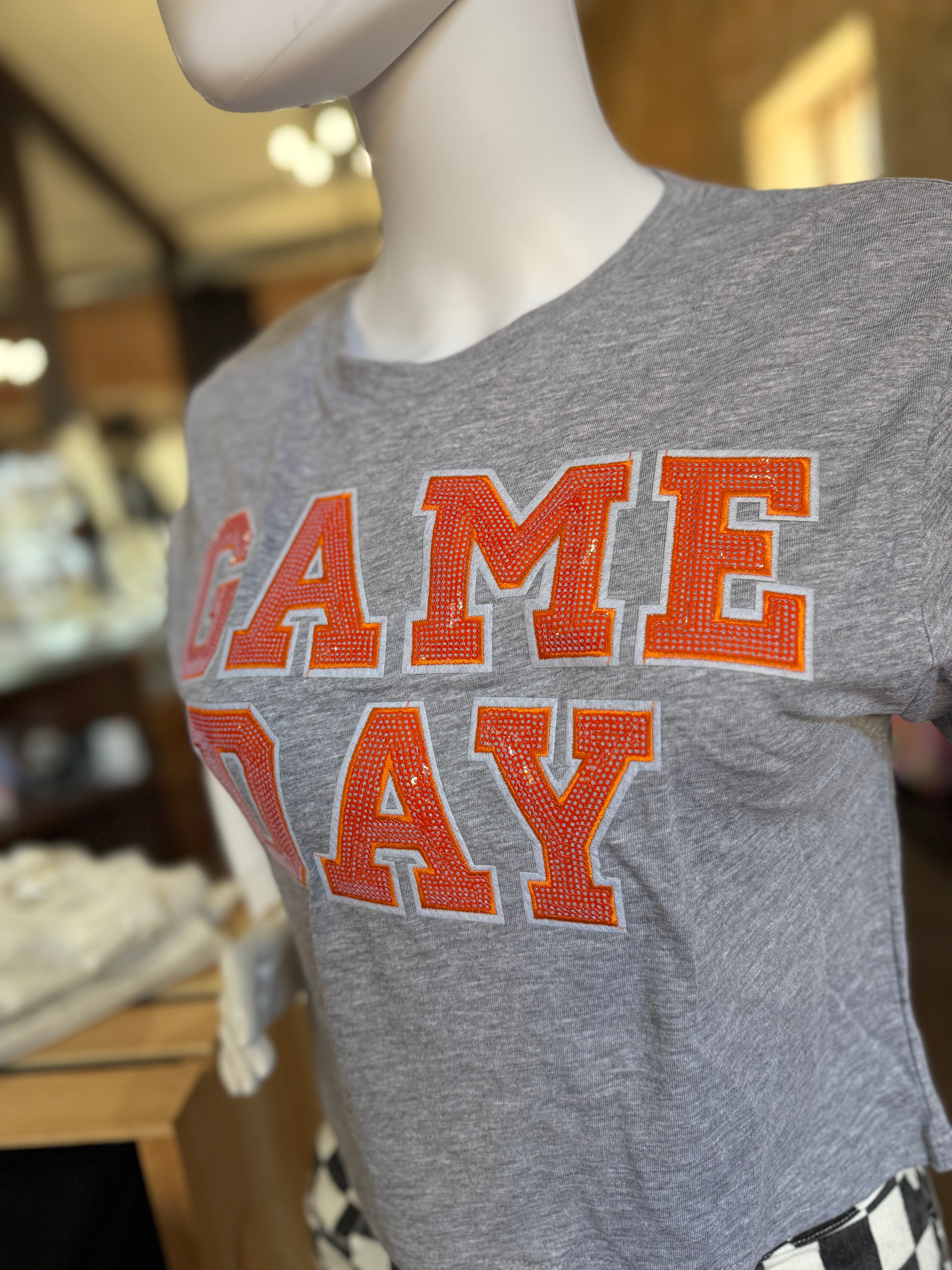 This Sequined Game Day Crop Top Tee adds a touch of sparkle to your game day attire. The sequins catch the light and draw attention, making you shine as a fan. The crop top style is also trendy and stylish. Perfect for showing off your team spirit with a touch of glamour.