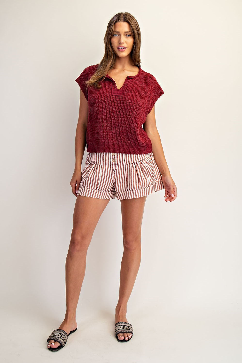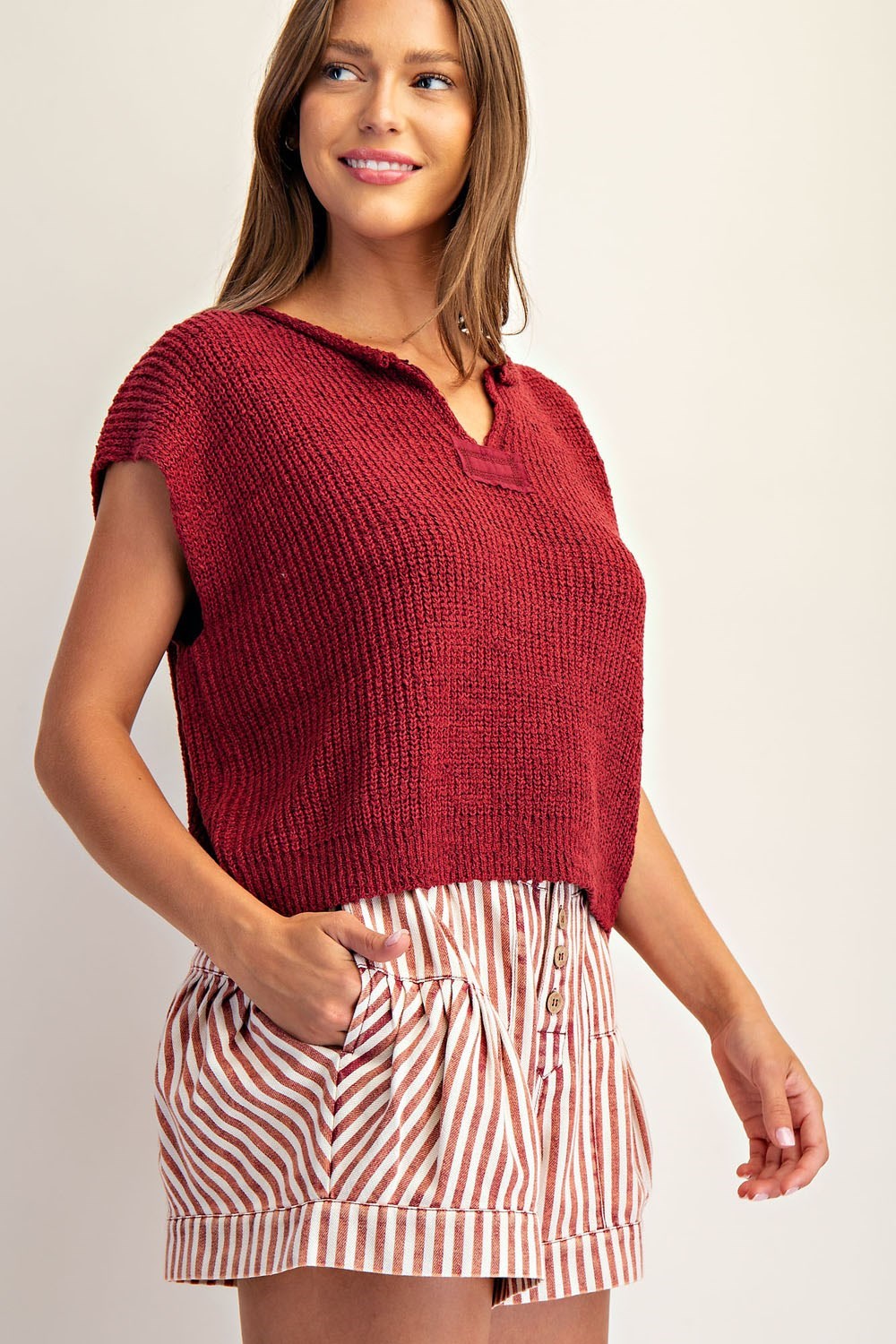Embrace easygoing style with this Solid Cap Sleeve Notched Neck Knit Sweater in Wine. Its soft, textured knit and open weave keep things light and breezy, while the playful notched neckline and tonal patch add a fun twist. Finished with a ribbed hem and relaxed cap sleeves, this top effortlessly blends comfort with casual charm for your wardrobe’s new favorite go-to.