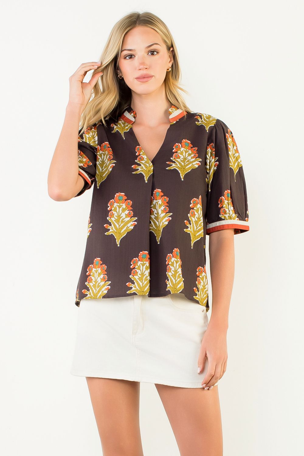 Brighten your wardrobe with this playful 1/2 sleeve top featuring charming floral details and rust and cream accent trims. The ruffled collar adds a flirty touch, making it perfect for casual outings or cozy days. Lightweight and stylish, it’s designed to keep you comfortable while turning heads.