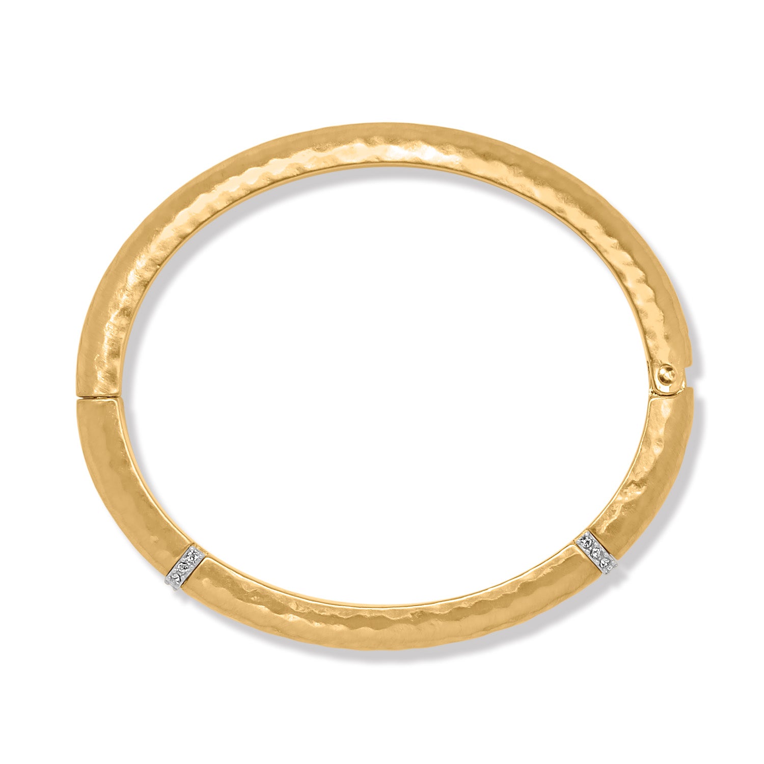 Geo means earth, and this hammered golden open hoop hinged bangle with hand-set crystal accents is a statement piece that has a look that is as strong as our globe.