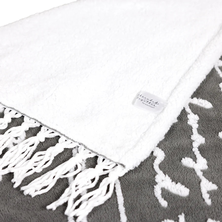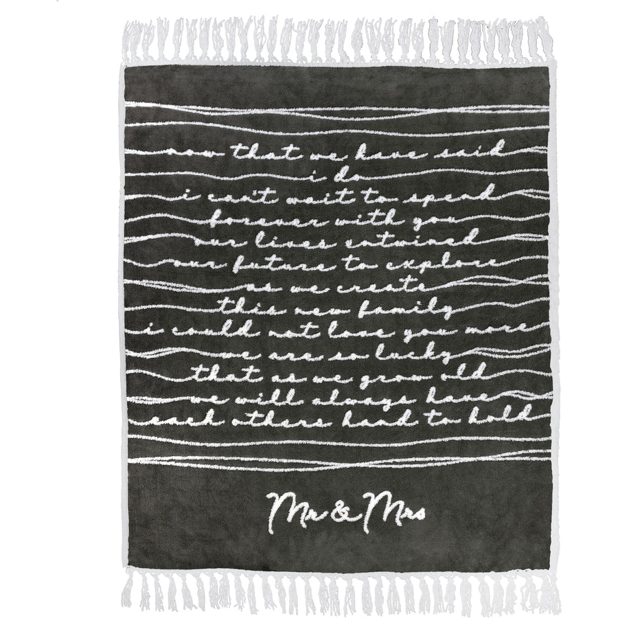 Risen cursive sherpa "Now That We Have Said “I do,” I Can’t Wait To Spend Forever With You. Our Lives Entwined, Our Future To Explore, As We Create This New Family, I Could Not Love You More. We Are So Lucky That As We Grow Old, We Will Always Have Each Other’s Hand To Hold. Mr. & Mrs." sentiment is conveyed by wave-like thread lines connecting the ends of the words to the edge of the blanket on beautiful dark gray background.